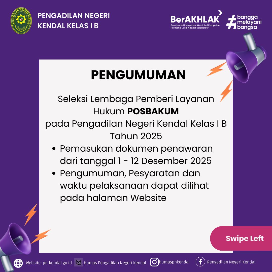 Berdasarkan Daftar Isian Pelaksanaan Anggaran (DIPA) Pengadilan Negeri Kendal Tahun Anggaran 2026 Nomor: SP-DIPA 005.03.2.099099/2026 akan dilaksanakan Pengadaan Jasa Konsultasi Pelayanan Pos Bantuan Hukum di Pengadilan Negeri Kendal.