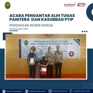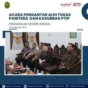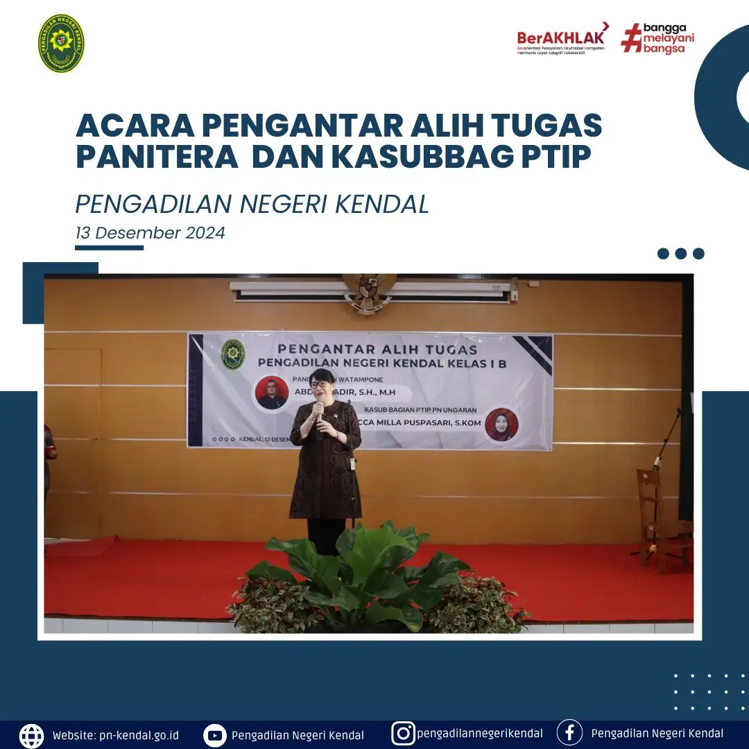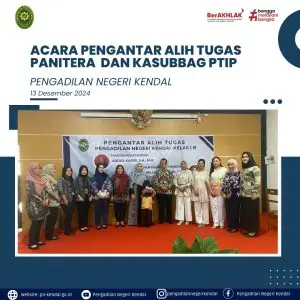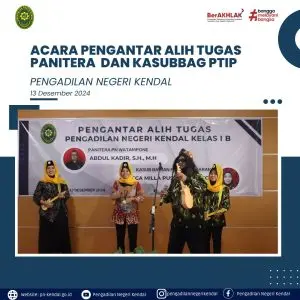 Pengadilan Negeri Kendal melaksanakan kegiatan alih tugas Panitera Pengadilan Negeri Kendal Bpk. Abdul Kadir, S.H. dan Kasubbag PTIP Ibu Amecca Mila Puspasari, S.Kom Pengadilan Negeri Kendal di ruang Sidang Tirta Pukul 08.00 WIB dalam acara ini dipimpin langsung Ketua Pengadilan Negeri Kendal Ibu Eva Meita Theodora Pasaribu, S.H., diikuti oleh Wakil Ketua, Bpk/Ibu Hakim, Pak/Ibu Panmud, Staf dam PPNPN Pengadilan Negeri Kendal dalam acara ini Bpk. Abdul Kadir, S.H. dan Kasubbag PTIP Ibu Amecca Mila Puspasri, S.Kom mengucapkan terimaksih banyak untuk Pengadilan Negeri Kendal dan memohon maaf apabila selama betugas banyak kesalahan dan khilafan.