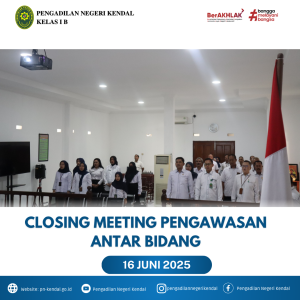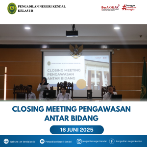 Pengadilan Negeri Kendal Kelas IB melaksanakan kegiatan Rapat penutupan (closing meeting) pengawasan antar bidang di Pengadilan Negeri (PN) Kendal adalah kegiatan untuk melaporkan hasil pengawasan internal yang telah dilakukan antar bidang dalam rangka menjaga mutu peradilan. Rapat ini merupakan bagian dari rangkaian audit internal, dan tujuannya adalah untuk memastikan implementasi sistem manajemen mutu yang efektif di PN Kendal, serta mempertahankan akreditasi yang telah diperoleh Pengadilan Negeri Kendal.