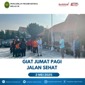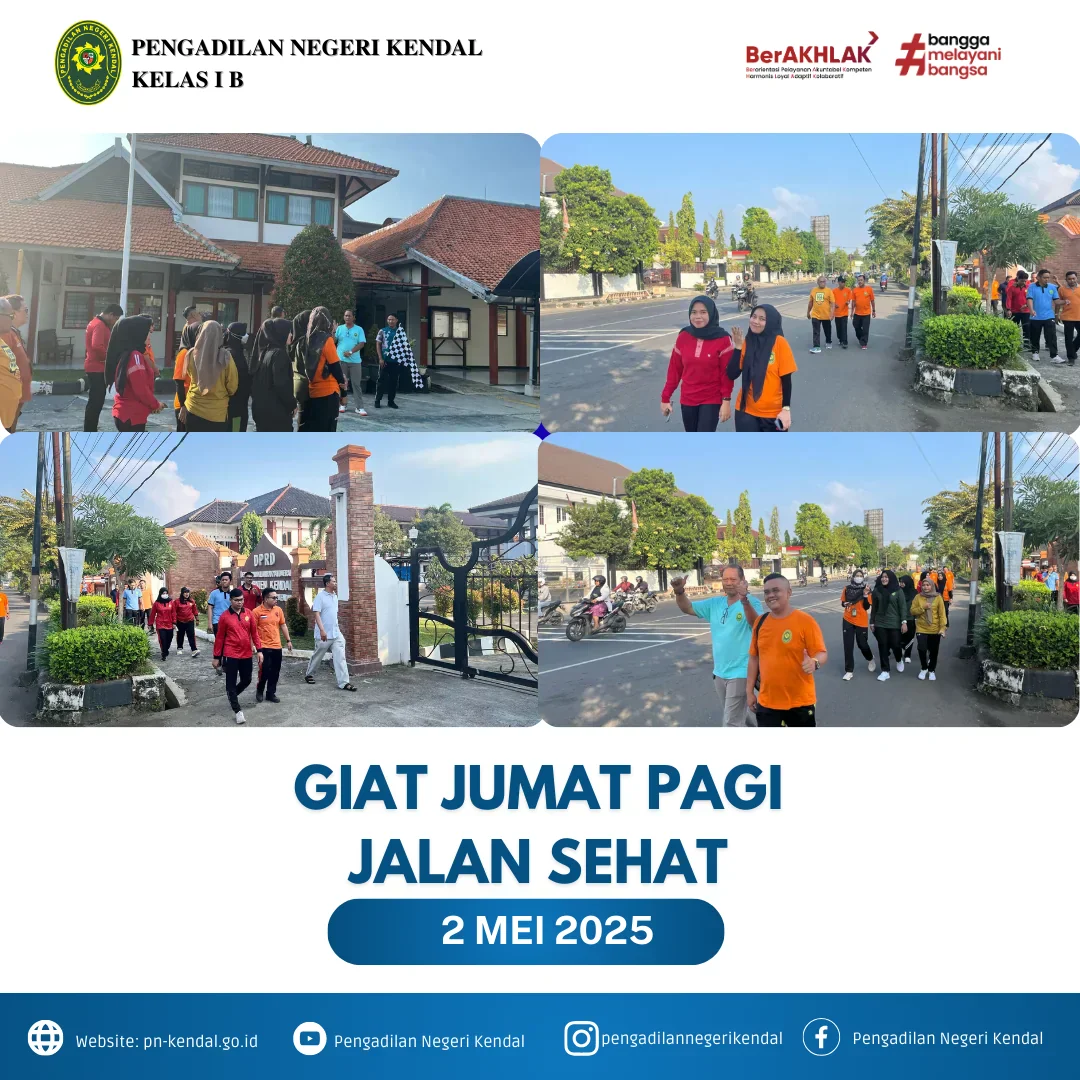 Kegiatan hari jumat pagi Pengadilan Negeri Kendal pukul 07.00 WIB mengadakan Jalan Sehat, Kegiatan ini dipimpin oleh Wakil Ketua Pengadilan Negeri Kendal Bapak Stepanus Yunanto Arywendo, S.H. Jalan Sehat ini diikuti oleh Hakim, Panitera, Sekretaris, Cakim seluruh Pegawai dan PPNPN Pengadilan Negeri Kendal, agar seluruh Pegawai selalu Sehat Jasmani dan Rohani dalam Bekerja.