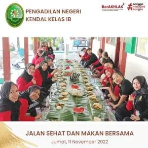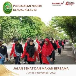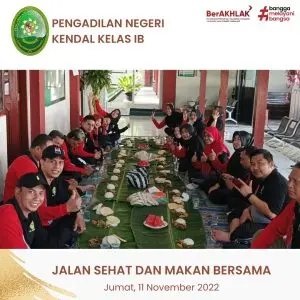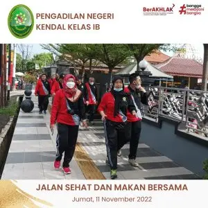 Kegiatan rutin yang di lakukan Pengadilan Negeri Kendal setiap jumat untuk menambah rasa kekeluargaan, pada Tanggal 11 November 2022 kegiatan yang dilakukan dengan cara jalan sehat dan makan bersama yang dikuti seluru Hakim, ASN, dan PPNPN Pengadilan Negeri Kendal, yang di pimpin langsung oleh Ketua Pengadilan Negeri Kendal Ibu Christina Endarwati, S.H., M.H. dan Wakil Pengadilan Negeri Kendal Ibu Nunung Kristiyani, S.H., M.H.