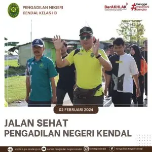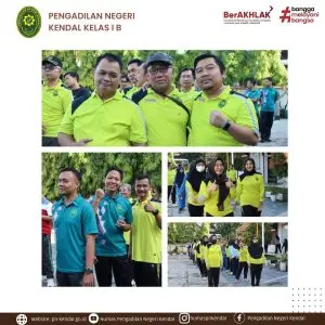 Kegiatan jumat pagi Pengadilan Negeri Kendal dengan melaksanakan jalan sehat di pimpin oleh Ketua Pengadilan Negeri Kendal Ibu Christina Endarwati, S.H.,M.H. di ikuti oleh Bpk/Ibu Hakim, Panitera, Sekretaris, Panmud, Kasubbag, Staff, PPNPN, Siswa-Siswi Magang dan Mahasiswa PKL kegiatan jalan sehat mulai Pukul 07.00 WIB, Kegiatan ini bertujuan agar keluarga Pengadilan Negeri Kendal semakin sehat dan semakin kompak.