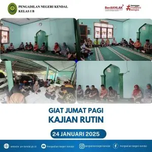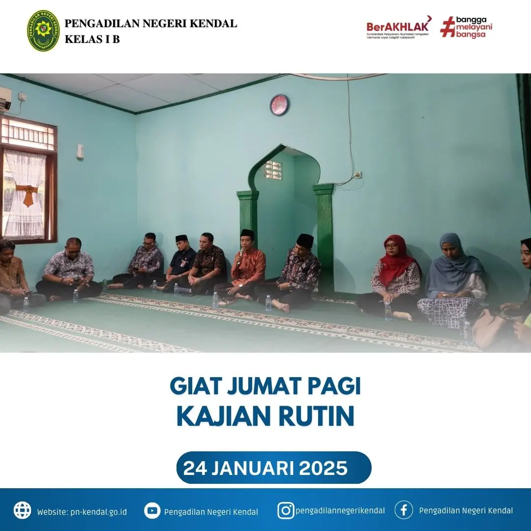 Kegiatan Pengadilan Negeri Kendal pada hari Jumat Pukul 08.00 WIB melaksanakan Kajian rutin kegiatan dihadiri oleh Hakim, Panitera, Sekretaris, Pejabat Struktural, Pejabat Fungsional, Staff, PPNPN, Siswa Magang. Kajian rutin bersama Ustadz Drs.KH. Fachrur Rozi, M.Ag. kajian ini akan rutin di laksanakan setiap bulan.
