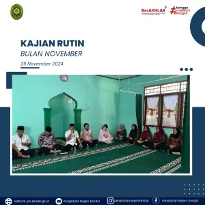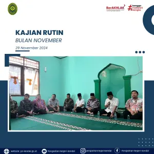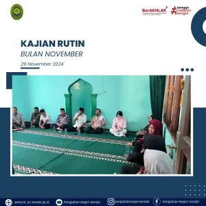Kegiatan Pengadilan Negeri Kendal pada hari Jumat Pukul 08.00 WIB melaksanakan Kajian rutin kegiatan dihadiri oleh Hakim, Panitera, Sekretaris, Pejabat Struktural, Pejabat Fungsional, Staff, PPNPN, Siswa Magang. Kajian rutin bersama Ustadz Drs. KH Zamaksari, kajian ini akan rutin di laksanakan setiap bulan.