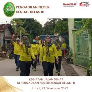 Dalam kegiatan mingguan Pengadilan Negeri Kendal selalu melakukan kegiatan mingguan untuk Jumat Tanggal 23 Desember 2022 melaksanakan kegiatan jalan sehat yang di pimpin langsung oleh Ketua Pengadilan Negeri Kendal Ibu Christina Endarwati, S.H., M.H. dan di ikuti oleh seluruh keluarga besar Pengadilan Negeri Kendal rute jalan sehat yang dilakukan star dari halaman belakang Pengadilan Negeri Kendal melewati Polres Kendal-Puskesmas Kendal-Baswalu Kendal dan kembali lagi ke Pengadilan Negeri Kendal.