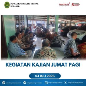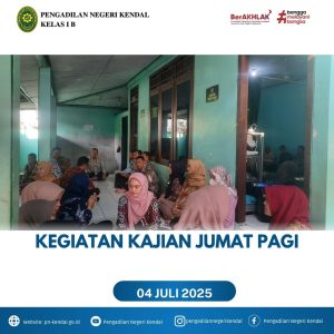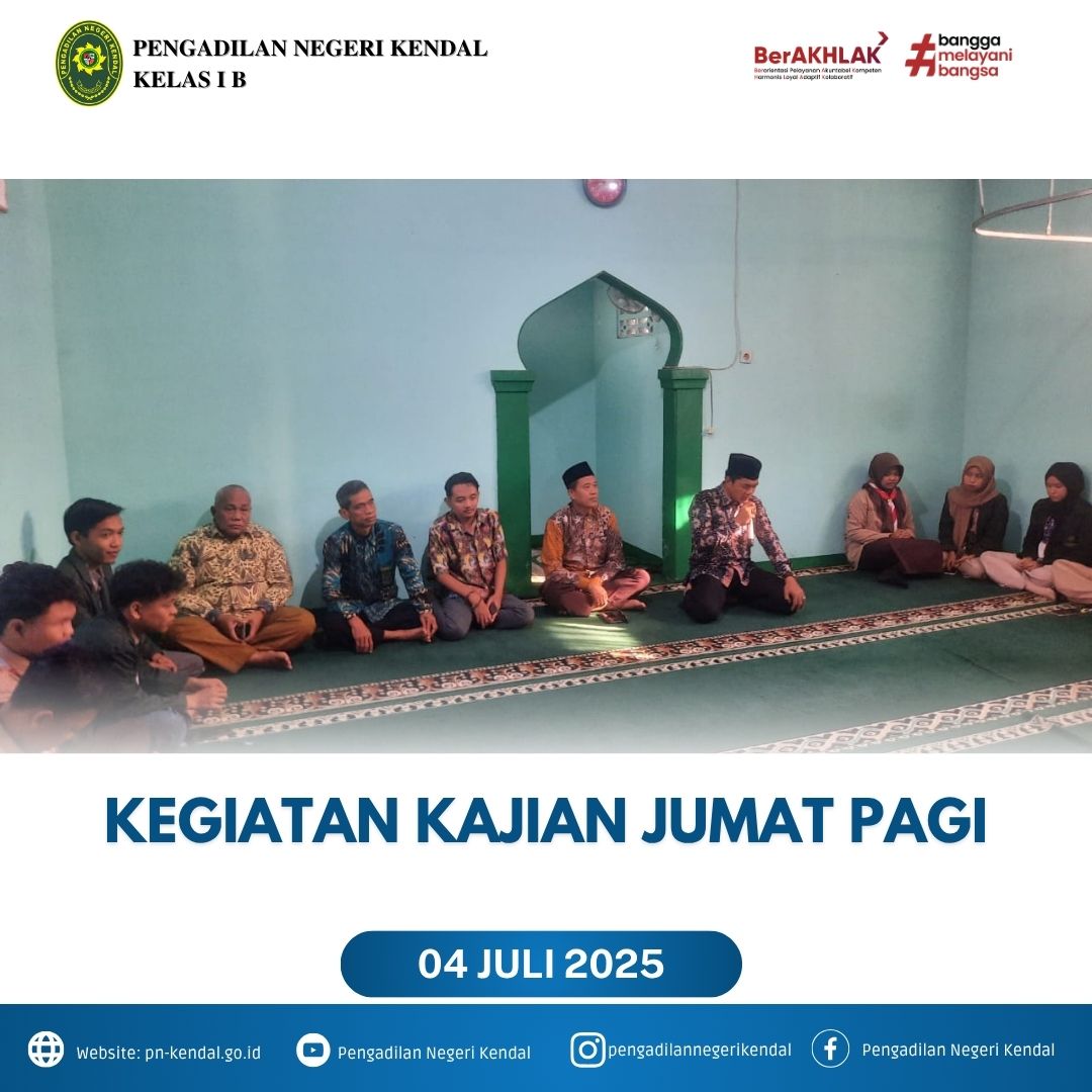 Kegiatan Pengadilan Negeri Kendal pada hari Jumat Pukul 08.00 WIB melaksanakan Kajian Rutin jumat pagi. Kegiatan dihadiri oleh Hakim, Panitera, Sekretaris, Pejabat Struktural, Pejabat Fungsional, Staff, PPNPN dan Siswa Magang. Kajian rutin bersama dipimpin oleh Ustadz Misbahul Munir.