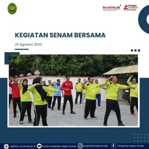 Kegiatan Pengadilan Negeri Kendal pada hari Jumat Pukul 07.00 WIB melaksanakan kegiatan senam bersama kegiatan ini dipimpin langsung Ketua Pengadilan Negeri Kendal Ibu Eva Meita Theodora Pasaribu, S.H., di ikuti oleh Hakim, Panitera, Sekretaris, Pejabat Structural, Pejabat Fungsional, Cakim, Staff, PPNPN, Siswa Magang. Senam bersama di pandu pemandu senam kegiatan senam di lakukan satu bulan sekali selain menyehatkan dan juga untuk menambah rasa Kekeluargan Pengadilan Negeri Kendal