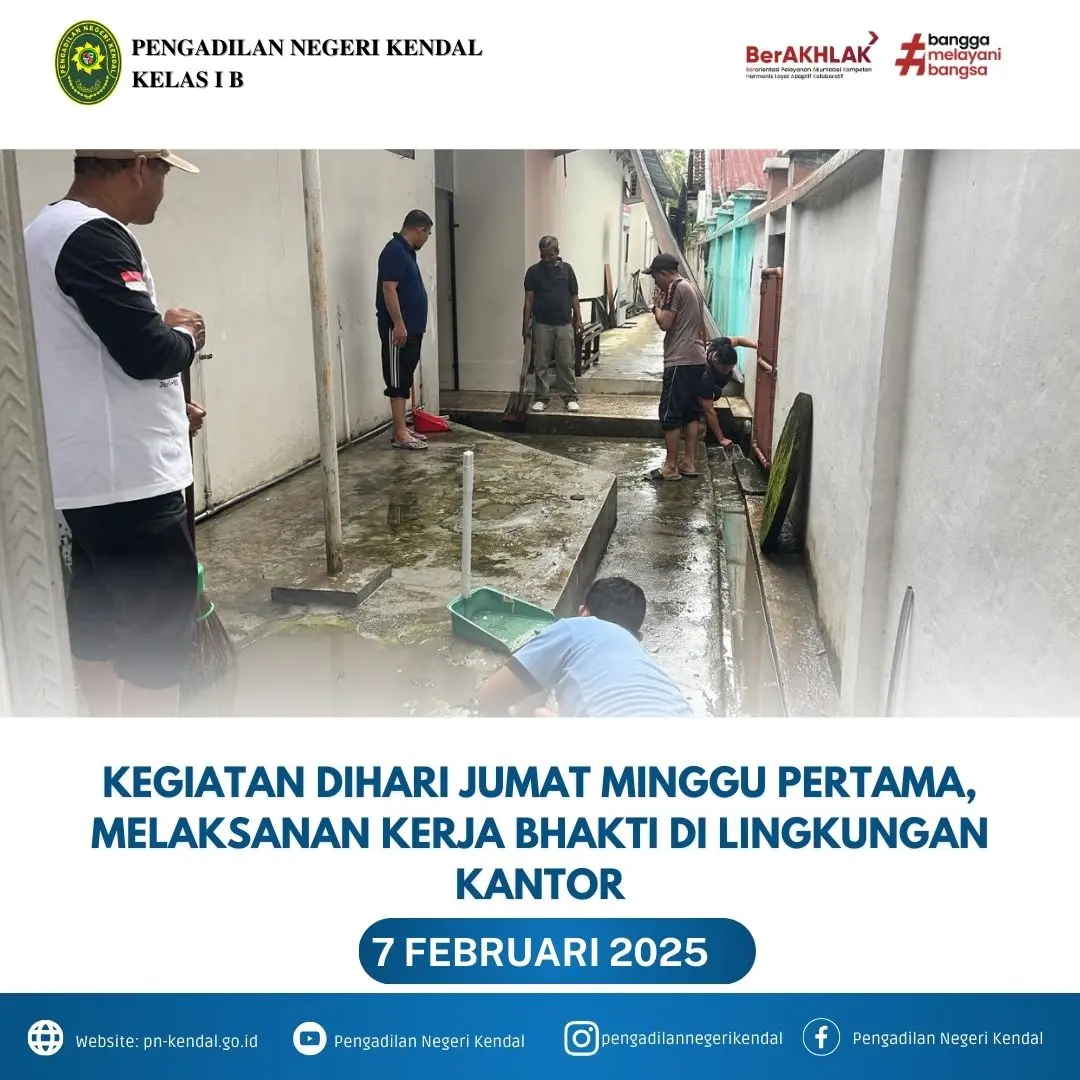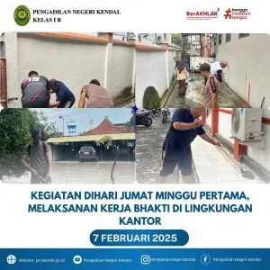 Kegiatan hari jumat pagi Pengadilan Negeri Kendal pukul 07.00 WIB mengadakan kerja bakti Merapikan Tanaman dan Halaman Kantor Pengadilan Negeri Kendal. Kegiatan ini dipimpin oleh Ketua Pengadilan Negeri Kendal Ibu Eva Meita Theodora Pasaribu, S.H. Kerja bakti ini diikuti oleh seluruh keluarga besar Pengadilan Negeri Kendal, dalam menanamkan rasa saling bergotong royong untuk merapikan tanaman dan membersihkan halaman kantor agar lebih bersih, rapi dan sejuk.