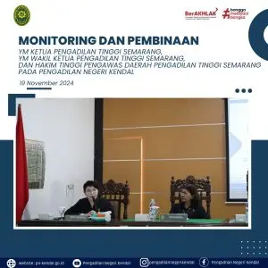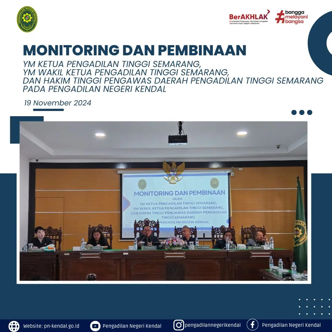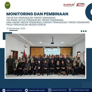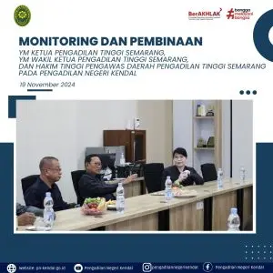 Pengadilan Negeri Kendal Hari Selasa Tanggl 19 November 2024 mulai Pukul 11.00 WIB melaksanakan Monitoring Dan Pembinaan YM Ketua Pengadilan Tinggi Semarang, YM Wakil Ketua Pengadilan Tinggi Semarang, dan Hakim Tinggi Pengawas Daerah Pengadilan Tinggi Semarang Pada Pengadilan Negeri Kendal Tahun 2024 pembukan Monitoring dan Pembinaan dilaksanakan di ruang Sidang Tirta YM Ketua Pengadilan Tinggi Semarang Bpk H. Mochamad Hatta, S.H., M.H menyampaikan monitoring dan pembinaan kepada semua keluarga besar pengadilan negeri Kendal tidak hanya itu wakil ketua pengadilan tinggi semarang YM Bpk Dr. Yapi, S.H., M.H. juga memberikan pembinaan kepada seluruh keluarga besar Pengadilan Tinggi Semarang monitoring dan Pembinaan Rutin Hakim Tinggi Pengawas Daerah Pengadilan Tinggi Semarang dilakukan setiap tahunnya tentu menjadi sebuah arahan dan pembinaan untuk Pengadilan Negeri Kendal untuk tetap melakukan administrasi sesuai dengan peraturan yang berlaku, kegiatan ini sampai dengan pukul 16.00 WIB hingga mengatar rombongan meninggalkan Pengadilan Negeri Kendal.