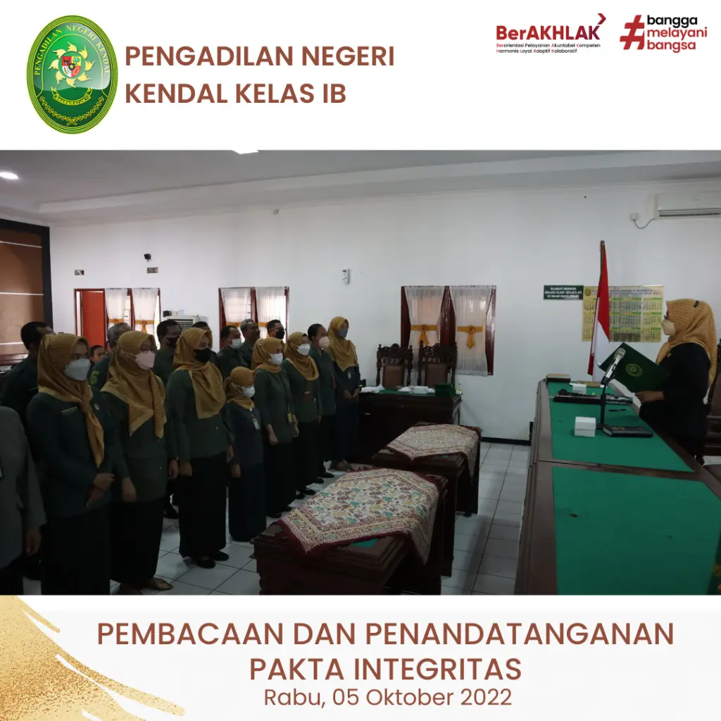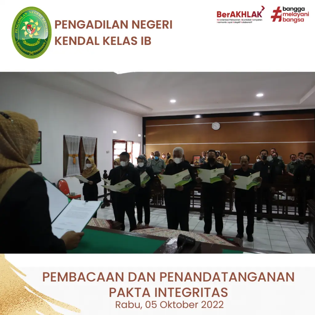 Hakim dan ASN Pengadilan Negeri Kendal melaksanakan kegiatan Pembacaan dan Penandatanganan Pakta Integritas. Kegiatan dipimpin oleh Ketua Pengadilan Negeri Kendal Ibu Christina Endarwati, S.H., M.H.