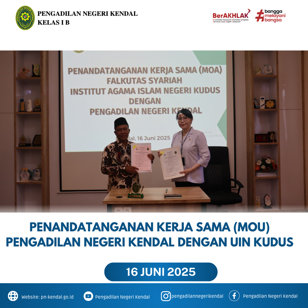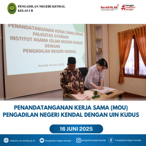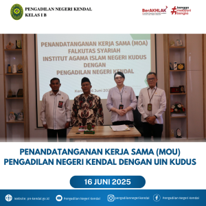 Pengadilan Negeri Kendal melaksanakan Penandatanganan Perjanjian Kerjasama (MOA) dengan Fakultas Syariah Institut Agama Islam Negeri Kudus dengan Pengadilan Negeri Kendal Pukul 08.30 WIB, Kegiatan Penandatanganan Perjanjian Kerjasama dilakukan oleh Ketua Pengadilan Negeri Kendal Ibu Eva Meita Theodora Pasaribu, S.H. dan Perwakilan dari Fakultas Syariah Institut Agama Islam Negeri Kudus disaksikan oleh, Panitera, Panmud Hukum Pengadilan Negeri Kendal.