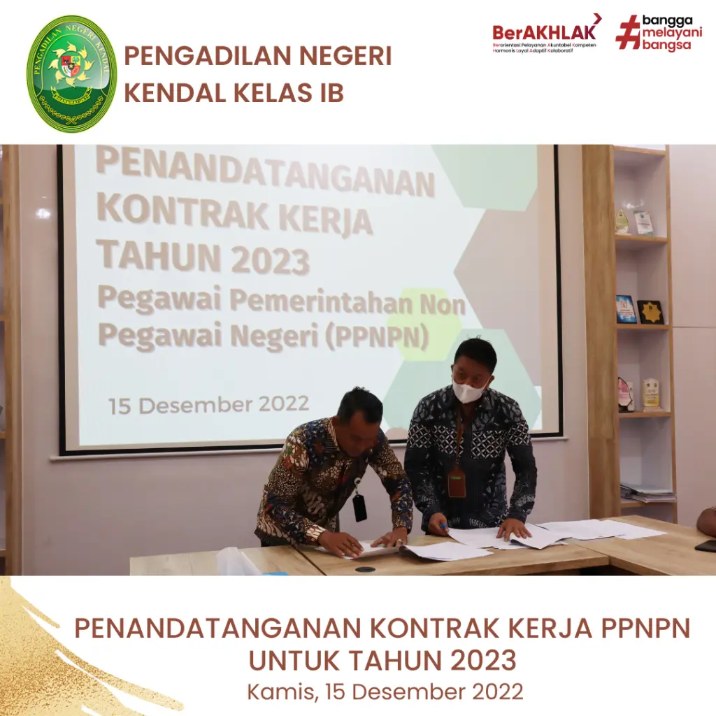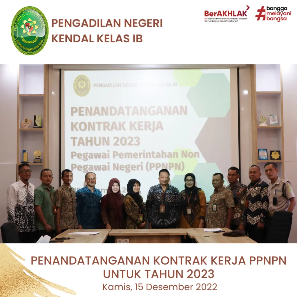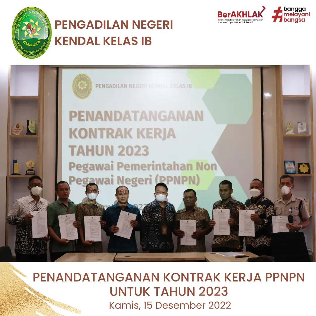 Sekretaris Pengadilan Negeri Kendal, Bapak Slamet Sudiarto, S.H., memimpin pelaksanaan Penandatanganan Kontrak Kerja Pegawai Pemerintah Non Pegawai Negeri (PPNPN) Pengadilan Negeri Kendal untuk tahun 2023.