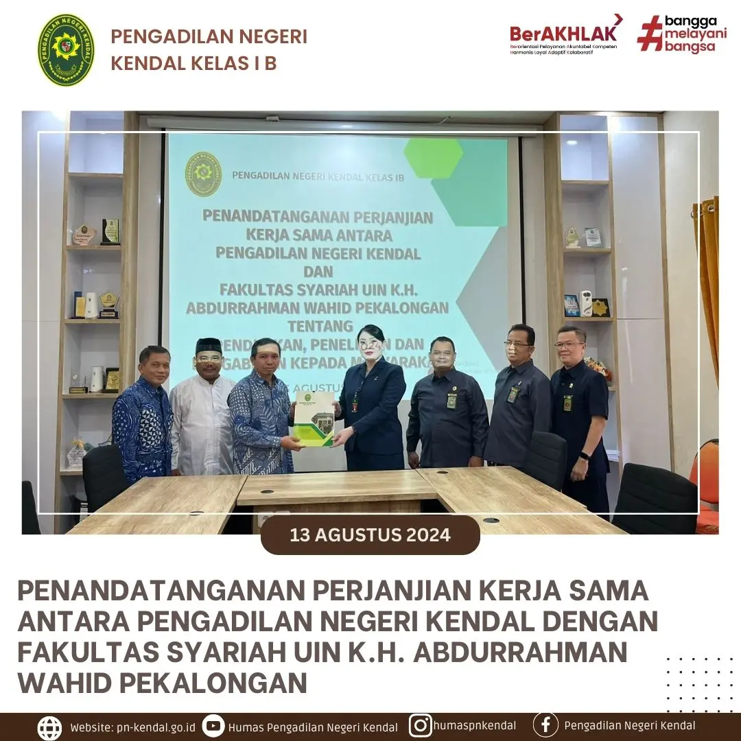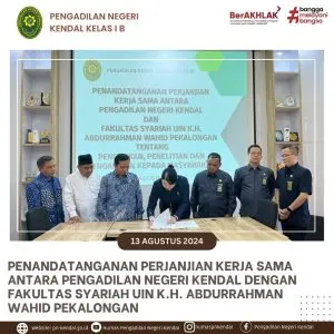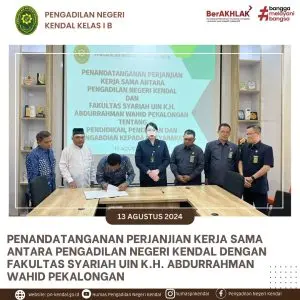 Pengadilan Negeri Kendal melaksanakan Penandatanganan Perjanjian Kerjasama dengan Fakultas Syariah UIN K.H. Abdurrahman Wahid Pekalongan Pukul 08.00 WIB, Kegiatan Penandatanganan Perjanjian Kerjasama dilakukan oleh Ketua Pengadilan Negeri Kendal Ibu Eva Meita Theodora Pasaribu, S.H. dan Dekan Fakultas Syariah UIN K.H. Abdurrahman Wahid Pekalongan Bapak Dr. Akhmad Jalaludin, M.A. dan disaksikan oleh, Panitera, Sekretaris Pengadilan Negeri Kendal, dan rombongan dari Fakultas Syariah UIN K.H. Abdurrahman Wahid Pekalongan.