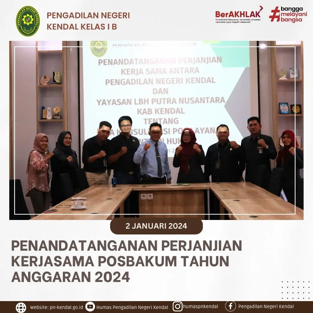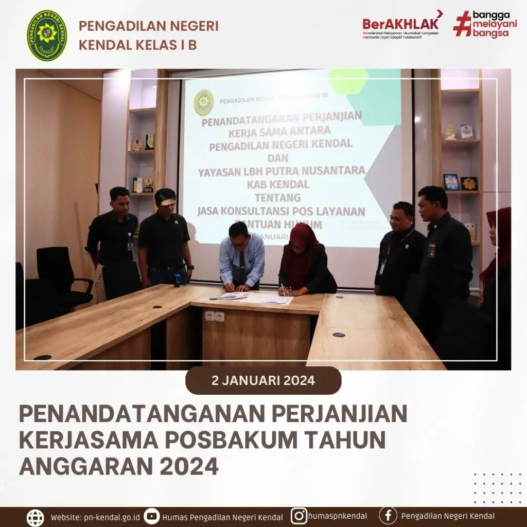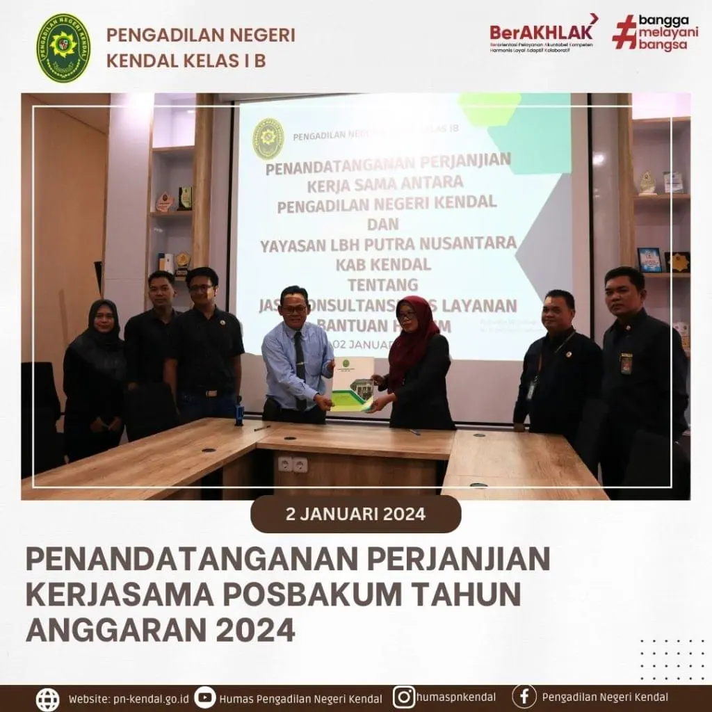 Pengadilan Negeri Kendal melaksanakan Penandatanganan Perjanjian Kerjasama dengan Yayasan Lembaga Bantuan Hukum Putra Nusantara Kendal sebagai Penyedia jasa layanan Pos Bantuan Hukum di Pengadilan Negeri Kendal.