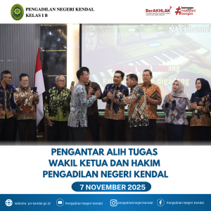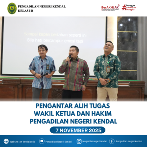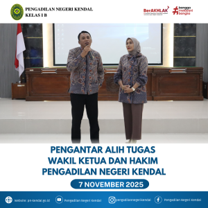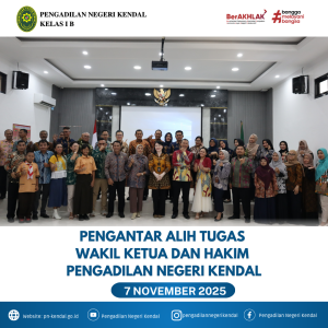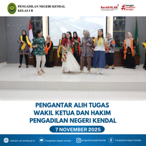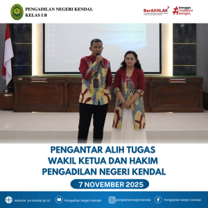 Tepat hari Jumat Tanggal 07 November 2025 Pukul 09.30 WIB Pengadilan Negeri Kendal mengadakan acara pengatar alih tugas Wakil ketua Bpk. Stephanus Yunanto Arywendho, S.H. Dan Hakim Bpk. Bustaruddin, S.H., M.H. kegiatan ini dipimpin oleh Ketua Pengadilan Negeri Kendal Ibu Eva Meita Theodora Pasaribu, S.H.M.H diikuti oleh Hakim, Panitera, Sekretaris, Pejabat Struktural, Pejabat Fungsional dan seluruh keluarga besar Pengadilan Negeri Kendal, acara berjalan dengan baik dan lancar.