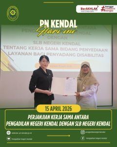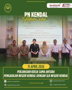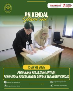 Pada Hari Rabu Tanggal 15 April 2026 dilaksanakan Penandatanganan Perjanjian Kerja Sama Antara Pengadilan Negeri Kendal dan SLB Negeri Kendal. Pada acara tersebut Pengadilan Negeri Kendal dipimpin oleh Ketua Pengadilan Negeri Kendal dan diikuti oleh Panitera, Sekretaris dan dari pihak SLB Negeri Kendal yang diwakili oleh Pimpinan lembaga tersebut.