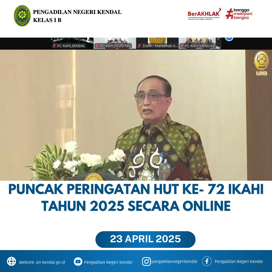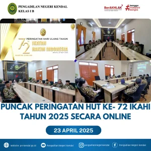 Bertempat diruang Command Center Pengadilan Negeri Kendal, pada hari Rabu Pukul 08.30 WIB  Pengurus Cabang IKAHI Kabupaten Kendal mengikuti kegiatan Puncak Peringatan HUT Ke- 72 IKAHI Tahun 2025 yang dilaksanakan secara Online. Kegiatan ini diikuti oleh Ketua Pengadilan Negeri Kendal Ibu Eva Meita Theodora Pasaribu, S.H., Ketua Pengadilan Agama Kabupaten Kendal Dr. Ahmad Farhat, S.Ag.,S.H.,M.H.I., dan Wakil Ketua Pengadilan Negeri Kendal, Wakil Ketua Pengadilan Agama beserta para Hakim Pengadilan Negeri maupun Pengadilan Agama Kabupaten Kendal.