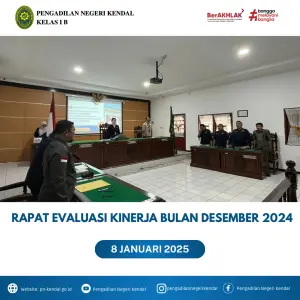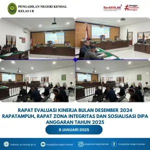 Pengadilan Negeri Kendal pada hari rabu Pukul 08.30 WIB diruang Sidang Tirta melaksanakan Rapat Pembinaan Dan Monitoring Evaluasi Kinerja, Rapat Ampuh, Rapat Zona Integritas dan Sosialisasi DIPA Anggaran Tahun 2025 dipimpin oleh Ketua Pengadilan Negeri Kendal Ibu Eva Meita Theodora Pasaribu, S.H. diikuti Hakim, Panitera, Sekretaris, pejabat Struktural, pejabat fungsional, Staf dan PPNPN. Dalam rapat Evaluasi Kinerja Monitoring Ketua Pengadilan Negeri Kendal memberikan pembinaan kepada seluru keluarga besar Pengadilan Negeri Kendal dengan selalu mengingatkan dalam penginputan SIPP harus tepat waktu agar tidak muncul Monitoring Implementasi SIPP, persidangan agar bisa dimulai lebih cepat, demi memberikan pelayanan yang terbaik untuk para pencari keadilan, juga tentang menjaga kebersihan kantor.