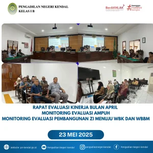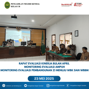 Pengadilan Negeri Kendal pada hari Jumat Pukul 14.00 WIB bertempat diruang Sidang Tirta melaksanakan Rapat Pembinaan Dan Monitoring Evaluasi Kinerja, Rapat AMPUH dan Rapat Zona Integritas Menuju WBK dan WBBM  dipimpin oleh Ketua Pengadilan Negeri Kendal Ibu Eva Meita Theodora Pasaribu, S.H., Didampingi Wakil Ketua dan diikuti oleh Hakim, Panitera, Sekretaris, Pejabat Struktural, Pejabat fungsional, Staf, Cakim dan PPNPN. Dalam rapat Evaluasi Kinerja Monitoring Ketua Pengadilan Negeri Kendal memberikan pembinaan kepada seluruh keluarga besar Pengadilan Negeri Kendal, persidangan agar bisa  dimulai lebih cepat, Pengisian SIPP, Penanganan perkara dan Pelayanan Publik lebih baik demi memberikan pelayanan yang terbaik untuk Masyarkat dan para pencari keadilan, juga tentang menjaga kebersihan kantor.