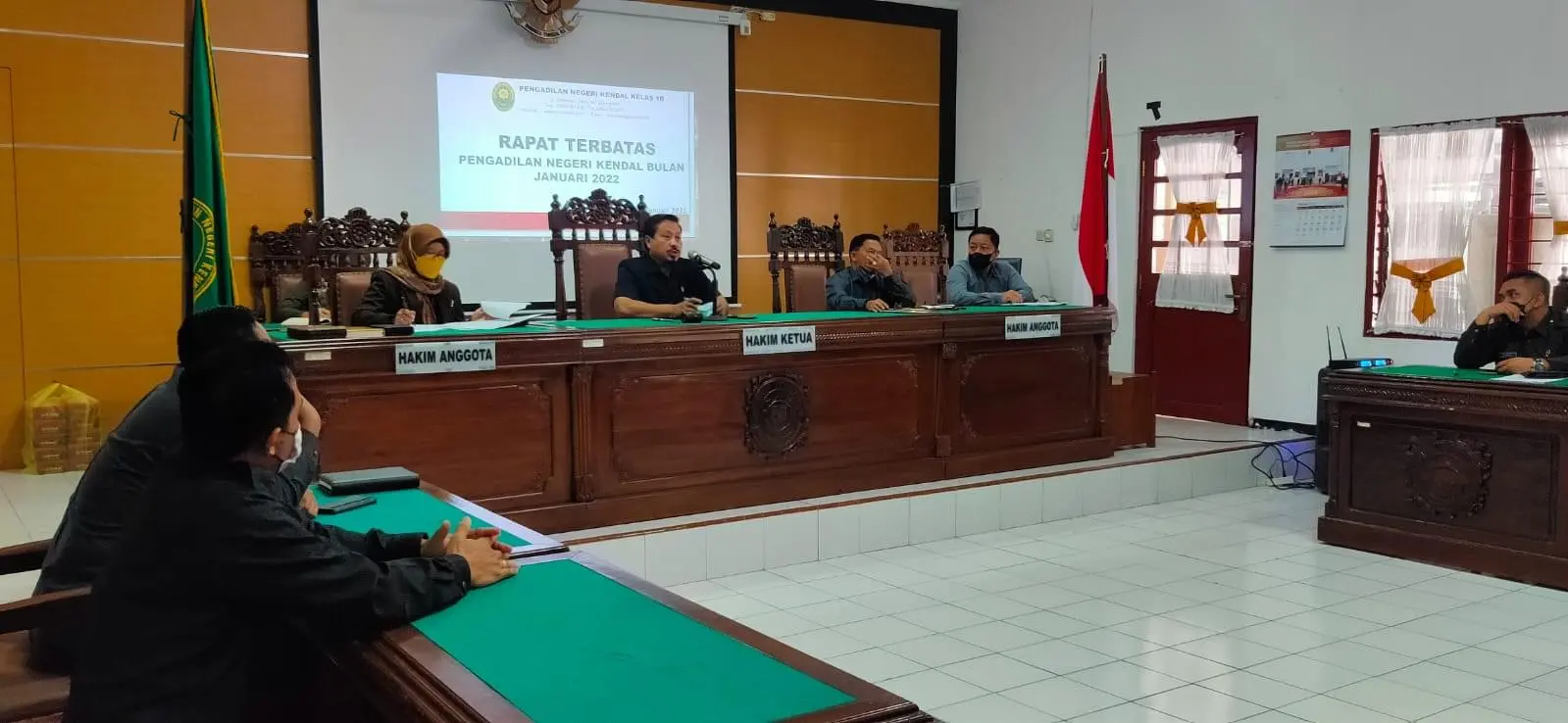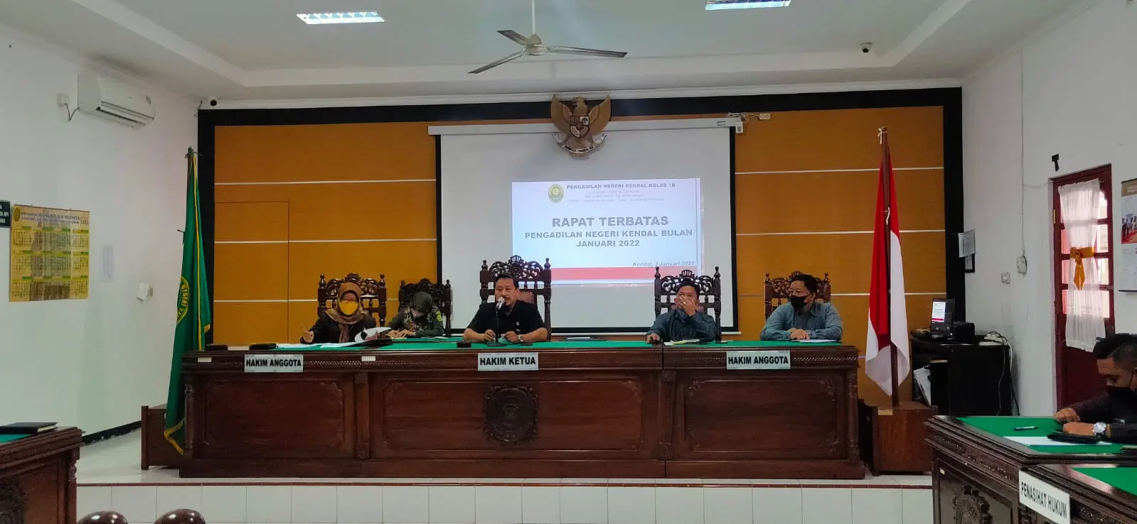 Pada hari Rabu tanggal 05 Januari 2022 bertempat di Ruang Sidang Tirta Pengadilan Negeri Kendal telah dilaksanakan Rapat Terbatas. Yang dipimpin oleh Ketua Pengadilan Negeri Kendal Bapak Mujiono, S.H.,M.H. dan dihadiri oleh Ibu Wakil Ketua Pengadilan Negeri Kendal Ibu Christina Endarwati, S.H, M.H. serta Bapak dan Ibu Hakim ,Panitera, Sekretaris, Panmud, Kasubbag, perwakilan Panitera Pengganti dan perwakilan Juru Sita Pengadilan Negeri Kendal dengan tetap menerapkan protokol kesehatan pencegahan penyebaran Covid-19.