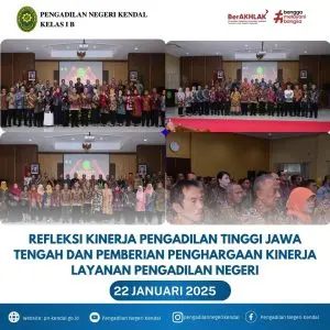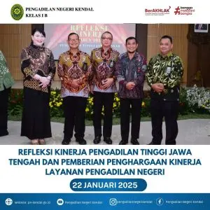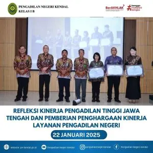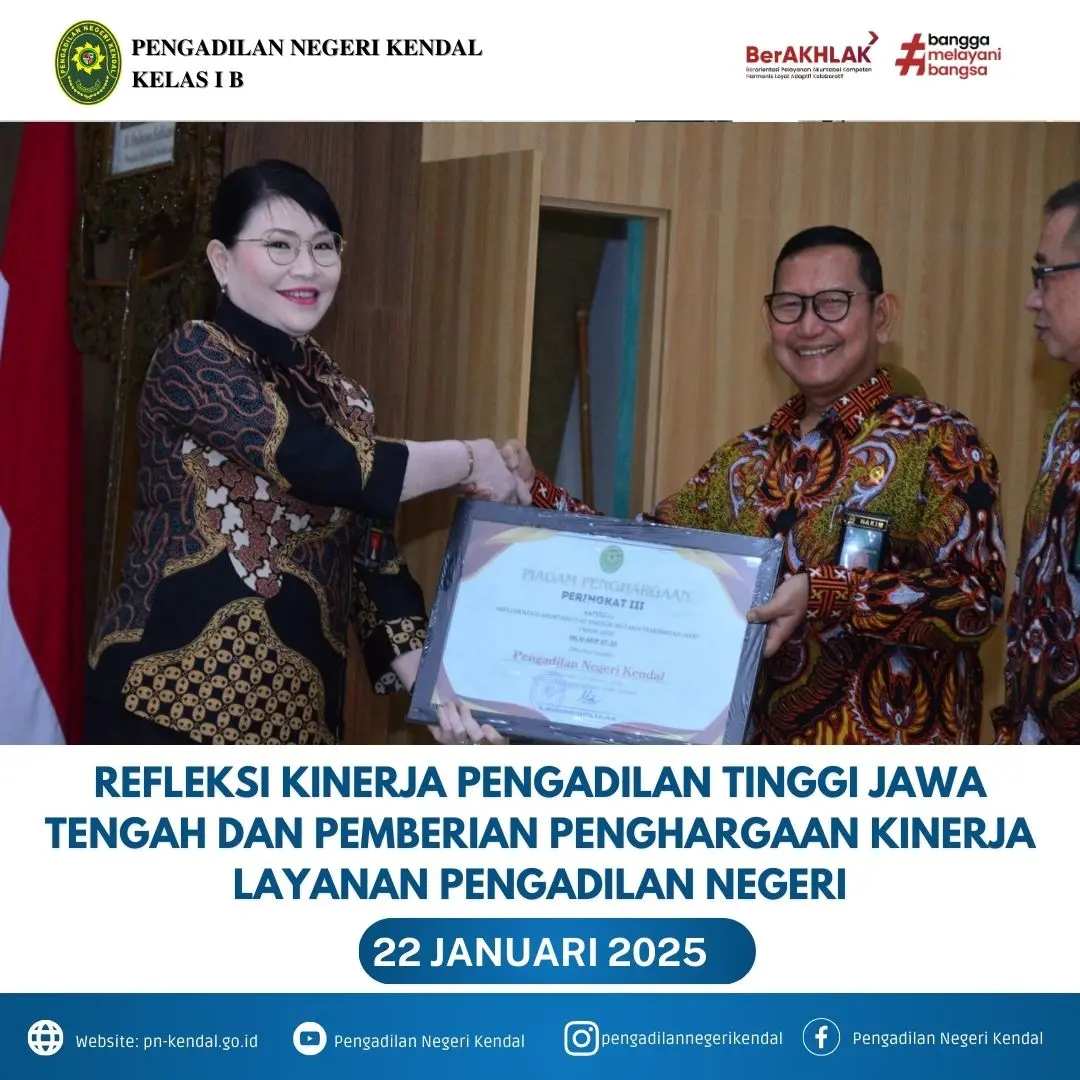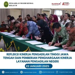 Ibu Ketua Pengadilan Negeri Kendal Eva Meita Theodora Pasaribu, S.H. didampingi oleh Bapak Panitera dan Seketaris Mengikuti kegiatan Refleksi Kinerja Pengadilan Tinggi Jawa Tengah, Bertempat di Aula Lantai 2 Pengadilan Tinggi Jawa Tengah di laksanakan acara Refleksi Kinerja Tahun 2024, Ketua Pengadilan Tinggi Jawa Tengah H. Mochamad Hatta menyampaikan laporan refleksi kinerja terkait Penghargaan yang telah di peroleh Pengadilan Tinggi Jawa Tengah dan Pengadilan Negeri Pada Wilayah Hukum Pengadilan Tinggi Jawa Tengah, pencapaian IKU, kinerja pada Kepaniteraan dan Kesekretariatan, serta Peningkatan Integritas Pengadilan Tinggi Jawa Tengah Tahun 2024.