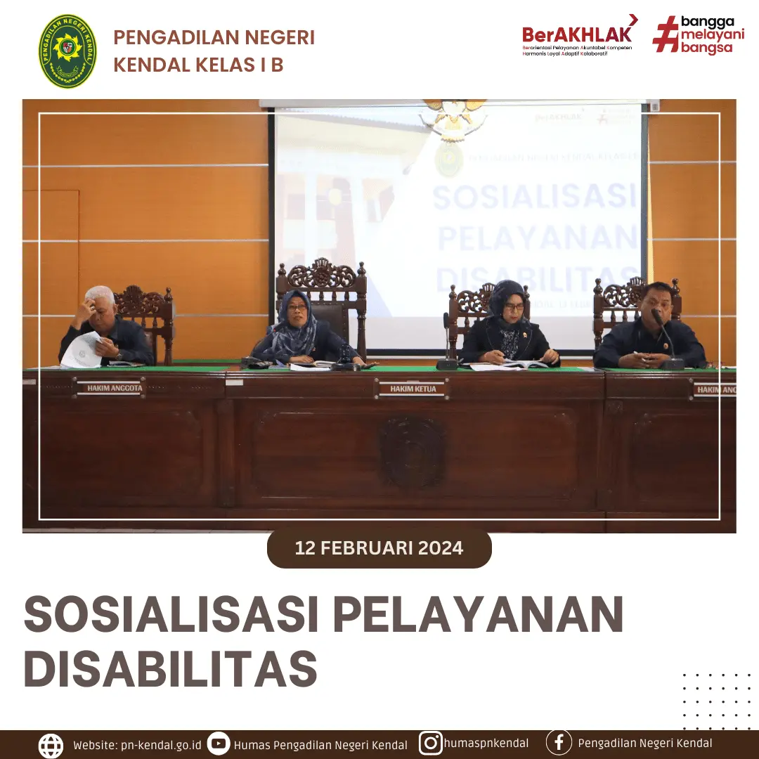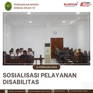 Pengadilan Negeri Kendal Hari Selasa Tanggal 13 Februari 2024 Pukul 10.30 WIB melaksanakan Sosialisasi Pelayanan Disabilitas diruang Sidang Tirta, dipimpin oleh Ketua Pengadilan Negeri Kendal Ibu Christina Endarwati, S.H.,M.H., diikuti oleh Wakil Ketua, Bpk/Ibu Hakim, Panitera, Sekretaris, Pejabat Fungsional, Pejabat Struktural, Calon Hakim, Staff dan PPNPN Pengadilan Negeri Kendal.