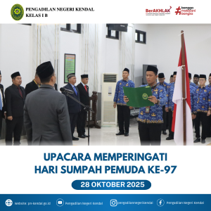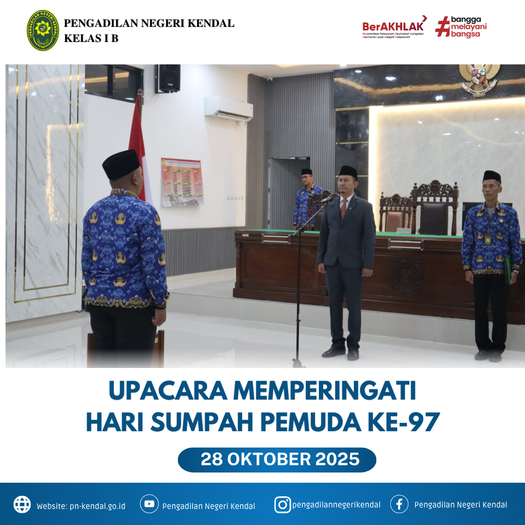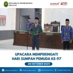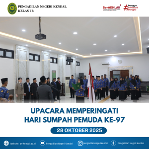 Hari Selasa tanggal 28 Oktober 2024 pukul 08.00 WIBÂ Pengadilan Negeri Kendal melaksanakan Upacara Bendera Peringatan Hari Sumpah Pemuda Tahun 2025 upacara dipimpin oleh Wakil Ketua Bpk. Stephanus Yunanto Arywendho, S.H. diikuti oleh Ibu Ketua Pengadilan Negeri Kendal , Hakim, Panitera, Sekretaris, Pejabat Struktural dan Pejabat Fungsional, Staff, P3K, Kegiatan upacara langsung secara lancar meskipun dilaksanakan didalam ruang Sidang Cakra karena terkendala hujan.