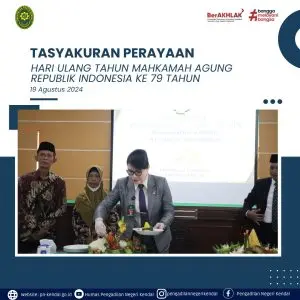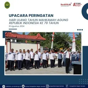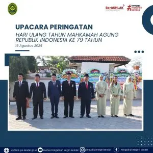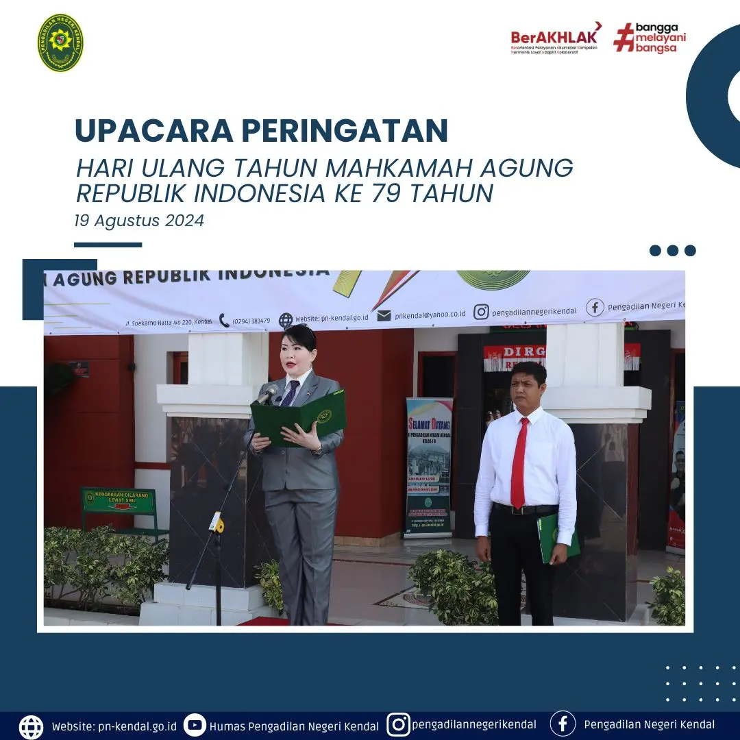 Pada hari senin tepat pukul 08.00 WIB dihalaman depan pengadilan negeri Kendal melaksanakan Upacara Peringatan Hari Ulang Tahun Mahkamah Agung Republik Indonesia Ke 79 Tahun upacara ini di pimpin langsung oleh ketua pengadilan negeri Kendal Ibu Eva Meita Theodora Pasaribu, S.H., di ikuti oleh Hakim, Panitera, Sekretaris, Pejabat Structural, Pejabat Fungsional, Ibu-Ibu Dharmayukti, Cakim, Staff, purna para purna bhakti,  PPNPN, dan siswa manggang. Upacara ini mengingatkan kembali bahwa Mahkamah Agung merupakan Badan Peradilan yang ada di Indonesia menjadikan Mahkamah Agung Peradilan Tangguh, Indonesia Maju, setelah melaksanakan upacara kemudian dilanjukan Tasyakuran Perayaan HARI Ulang Tahun Mahkamah Agung Republik Indonesia Ke 79 Tahun dengan potong tumpeng.